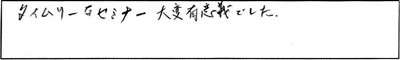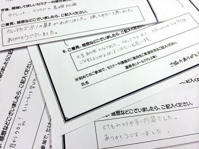 「今回は本当に基本的な内容でしたので、もう少しテキストや資料を用意してもらったり、レベル別のセミナーを希望します。出来ればビジネスにも使えるような内容でお願いします。」