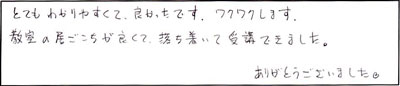 「とてもわかりやすくて、良かったです。ワクワクします。教室の居ごこちが良くて、落ち着いて受講できました。ありがとうございました。」